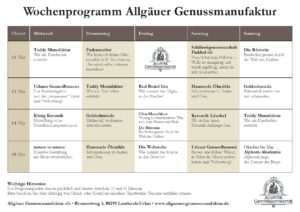 Immer um 11, 13, 14 und 15 Uhr bieten die Genuss- und Kunsthandwerker zusätzliche Programmpunkte für die Besucher an. Abhängig von Urlaub oder Krankheit einzelner Handwerker können Termine entfallen.